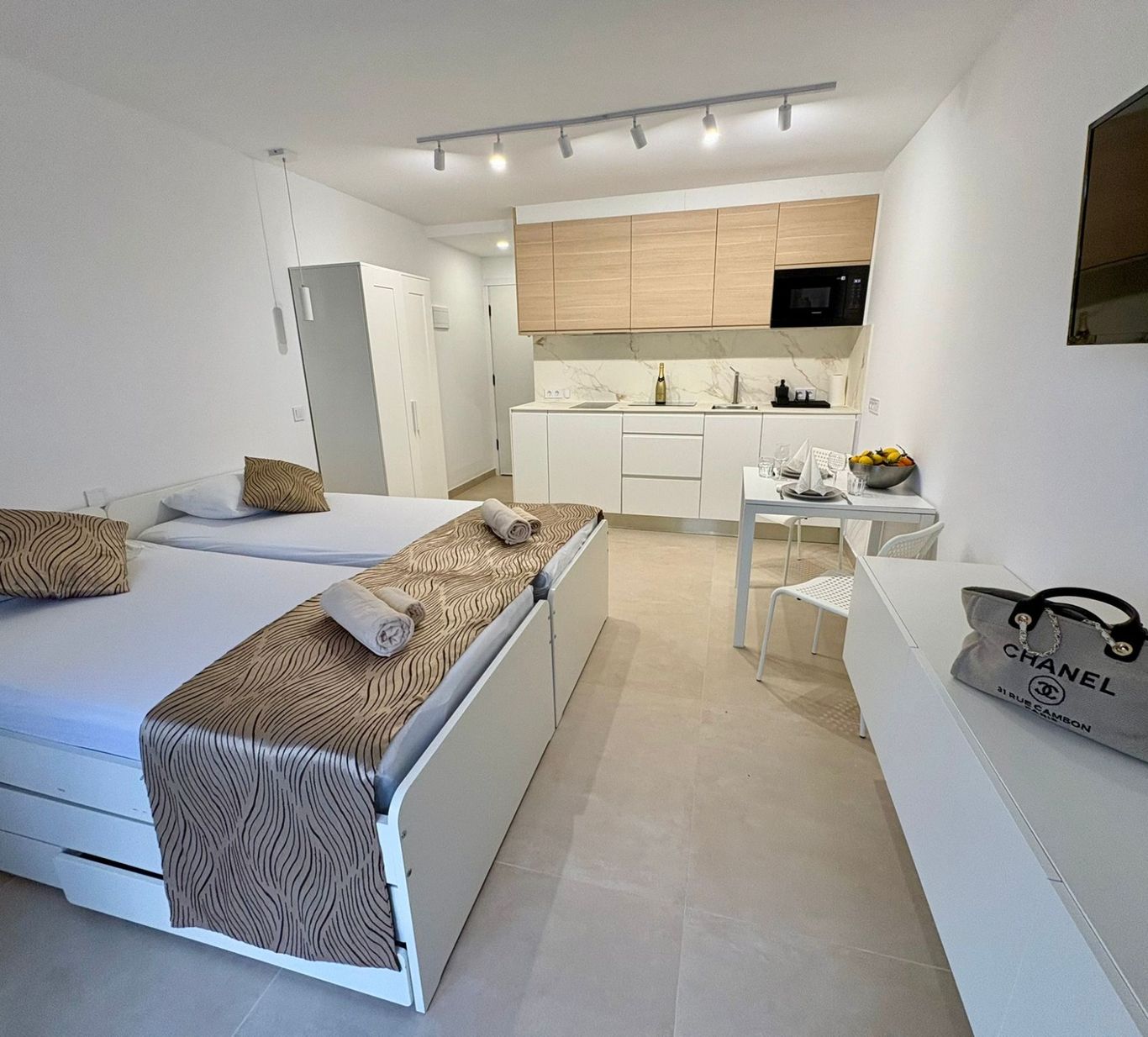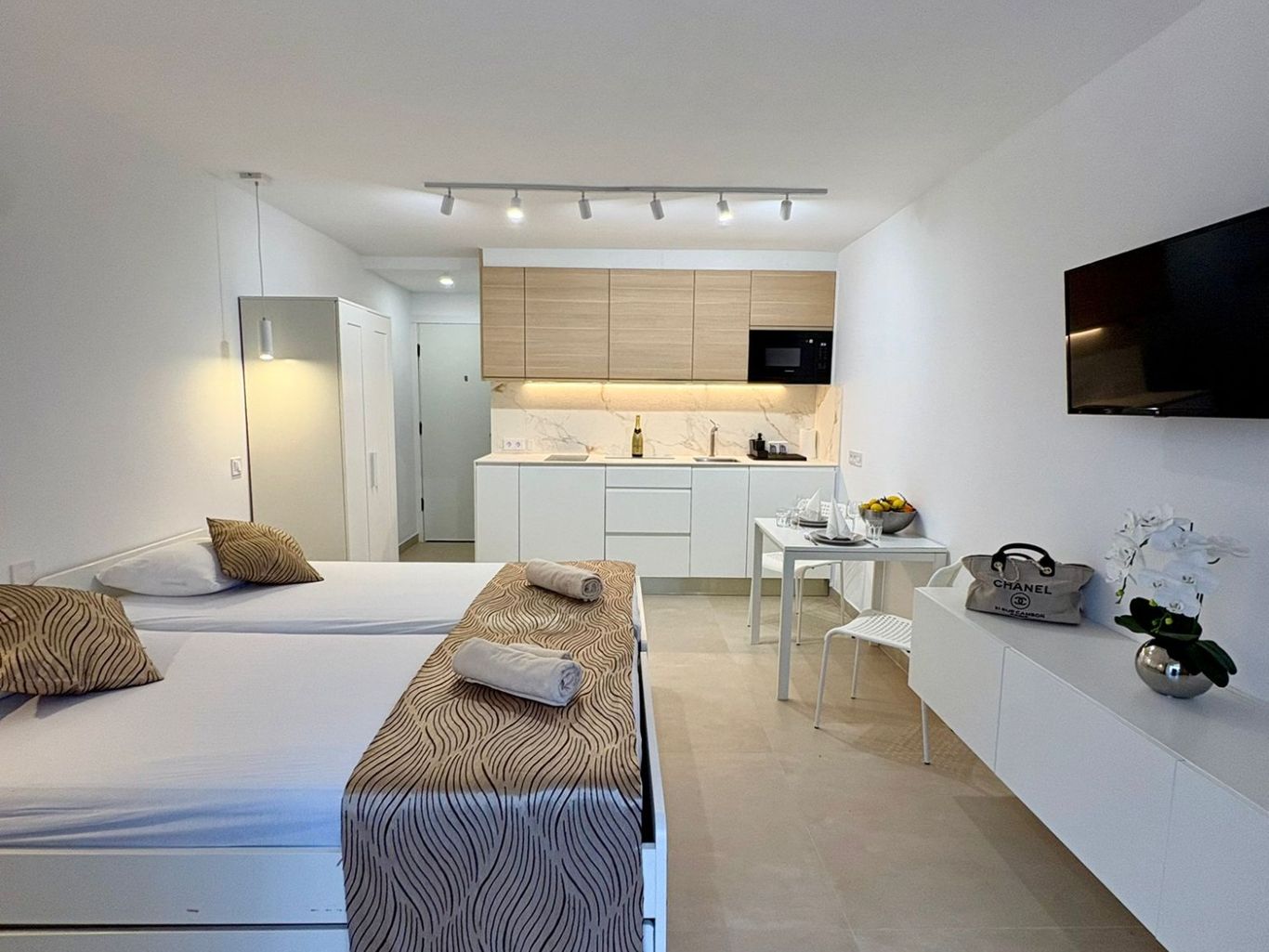 The living area of the apartment of approx. 30 sqm is divided into a living and sleeping area with a small integrated kitchenette and a bathroom. The apartment offers direct access to the covered balcony with a view of the surroundings and the busy street, with all imaginable infrastructure for your stay.